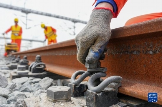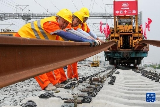 5月20日,在滬寧沿江高鐵太倉(cāng)站施工現(xiàn)場(chǎng),中鐵十二局的工程人員準(zhǔn)備進(jìn)行螺栓緊固作業(yè),將對(duì)接好的鋼軌固定。