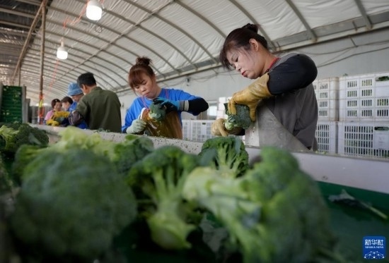 5月21日,河北省灤州市小馬莊鎮(zhèn)一家蔬菜種植合作社的社員在分揀收獲的西蘭花。