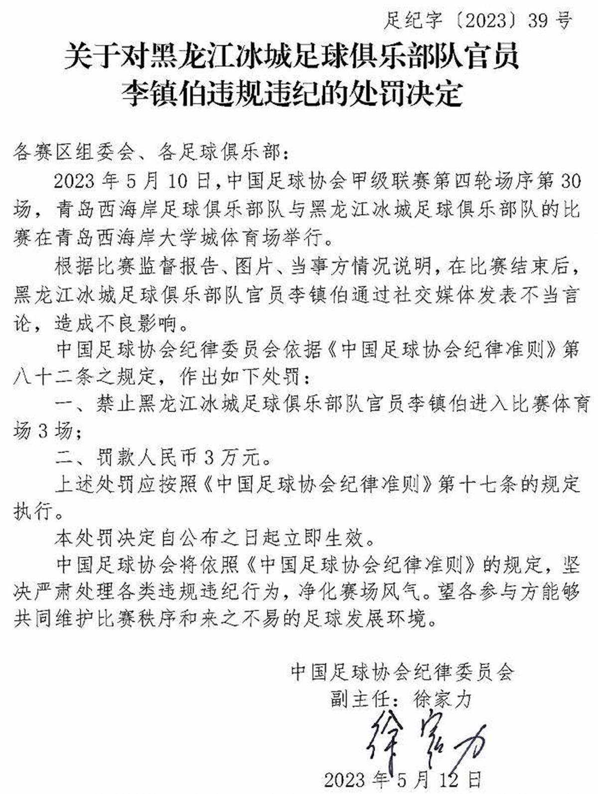 中國足協(xié)紀律委員會根據(jù)裁判員報告、比賽監(jiān)督報告、視頻、當(dāng)事方情況說明及聽證,認定楊帆實施暴力行為,于是依據(jù)《中國足球協(xié)會紀律準(zhǔn)則》第五十三條、第四十八條之規(guī)定,對他給予停賽4場、罰款人民幣4萬元的處罰。在這張罰單上,第一次出現(xiàn)了徐家力的名字。從這張罰單來看,中國足協(xié)紀律委員會定下了基調(diào),那就是嚴厲打擊球場暴力行為。