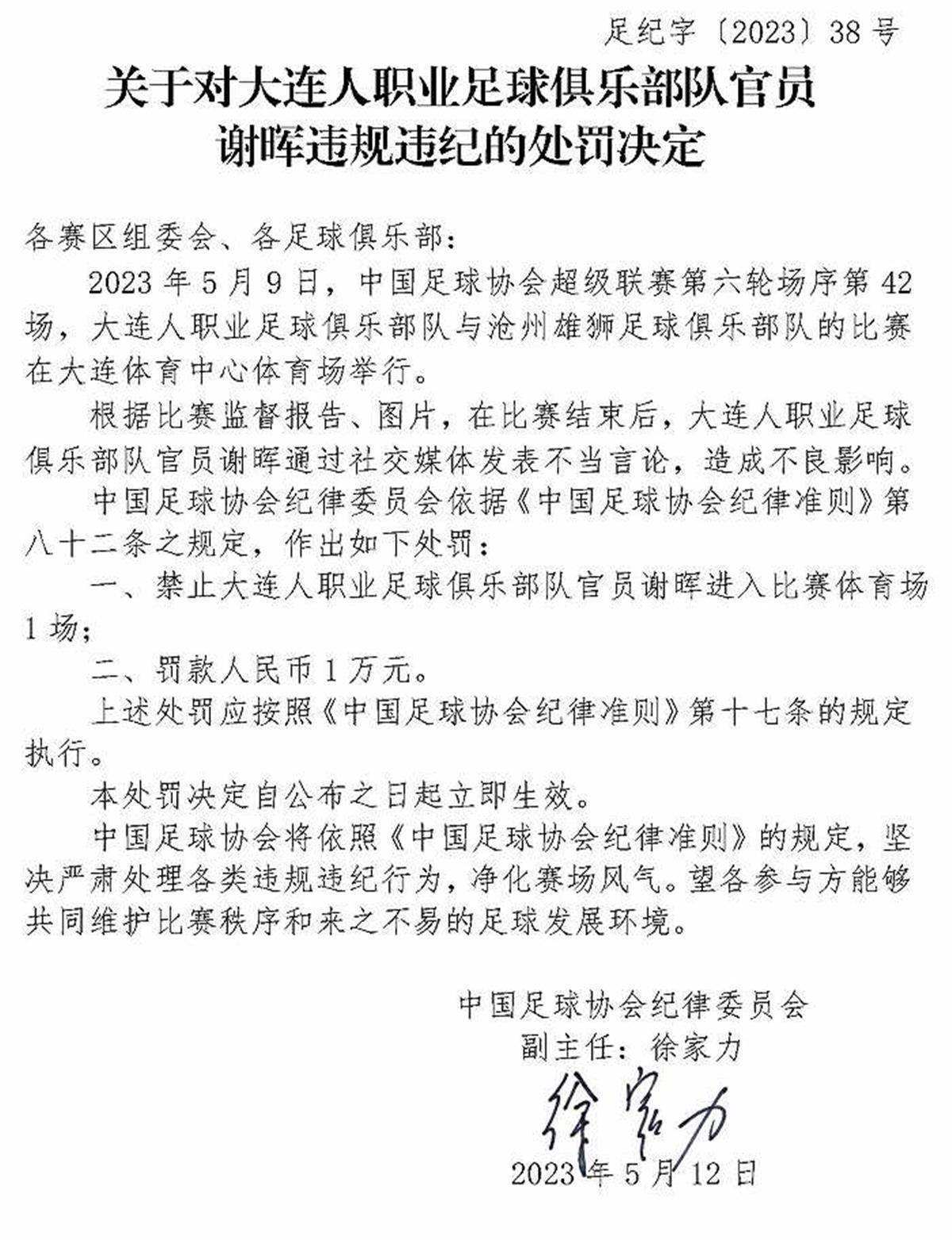 5月12日,中國足協(xié)紀律委員會接連開出三張罰單,對中超大連人隊的主教練謝暉,以及南通支云隊、黑龍江冰城隊的兩位俱樂部官員范兵和李鎮(zhèn)伯進行了處罰,共計罰款5萬元,并對三人追加禁賽。這三張罰單一出,引來外界的一片質(zhì)疑聲。