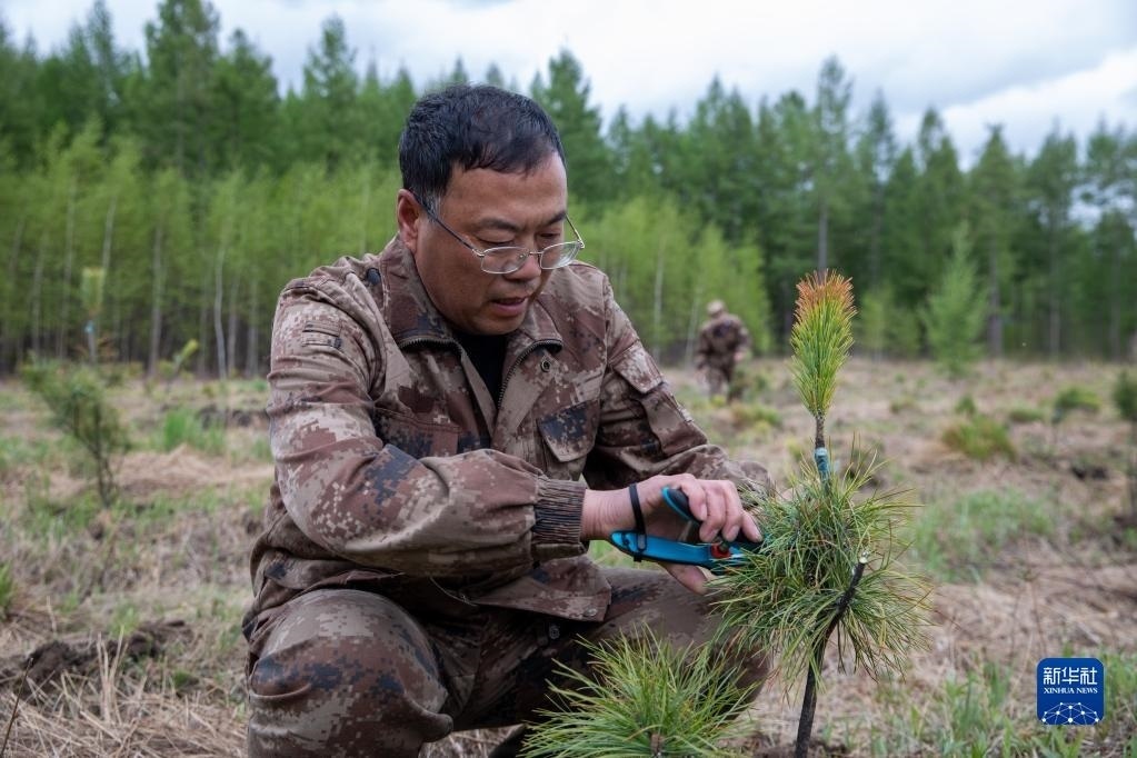 這是5月24日拍攝的伊春森工集團(tuán)上甘嶺林業(yè)局公司溪水林場內(nèi)栽種的紅松樹苗。