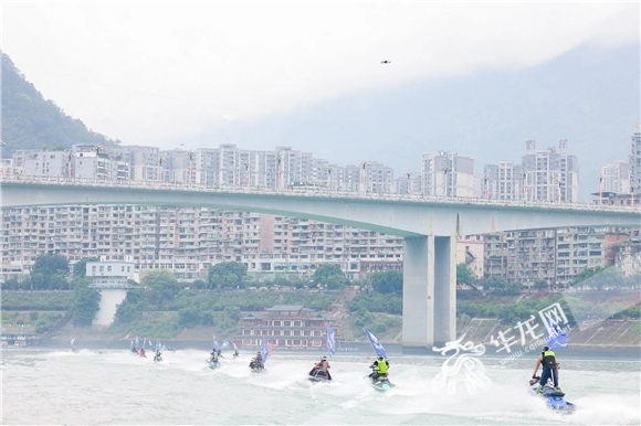 △來自全國各地的參賽選手騎著摩托艇入場。華龍網(wǎng)-新重慶客戶端 黃歡 攝