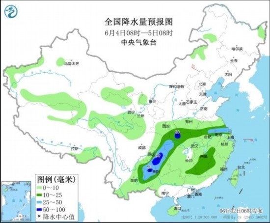 全國(guó)降水量預(yù)報(bào)圖(6月4日08時(shí)-5日08時(shí))