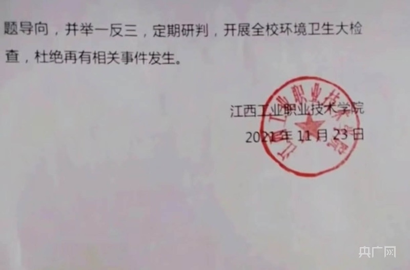 情況通報(bào)還提到,南昌市高新區(qū)市場(chǎng)監(jiān)督管理局接到情況報(bào)告后,第一時(shí)間派出執(zhí)法人員到江西工業(yè)職業(yè)技術(shù)學(xué)院開(kāi)展調(diào)查,問(wèn)詢(xún)學(xué)校工作人員、食堂負(fù)責(zé)人、當(dāng)事學(xué)生及相關(guān)知情人,對(duì)食品留樣進(jìn)行采樣檢測(cè)。
