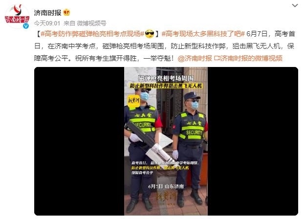 ·高考防作弊磁彈槍亮相山東濟(jì)南考點(diǎn)現(xiàn)場(chǎng):防止新型科技作弊,狙擊黑飛無(wú)人機(jī)。