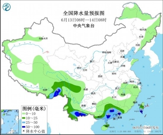 圖2 全國(guó)降水量預(yù)報(bào)圖(6月12日08時(shí)-13日08時(shí)) 圖片來(lái)源:中央氣象臺(tái)網(wǎng)站