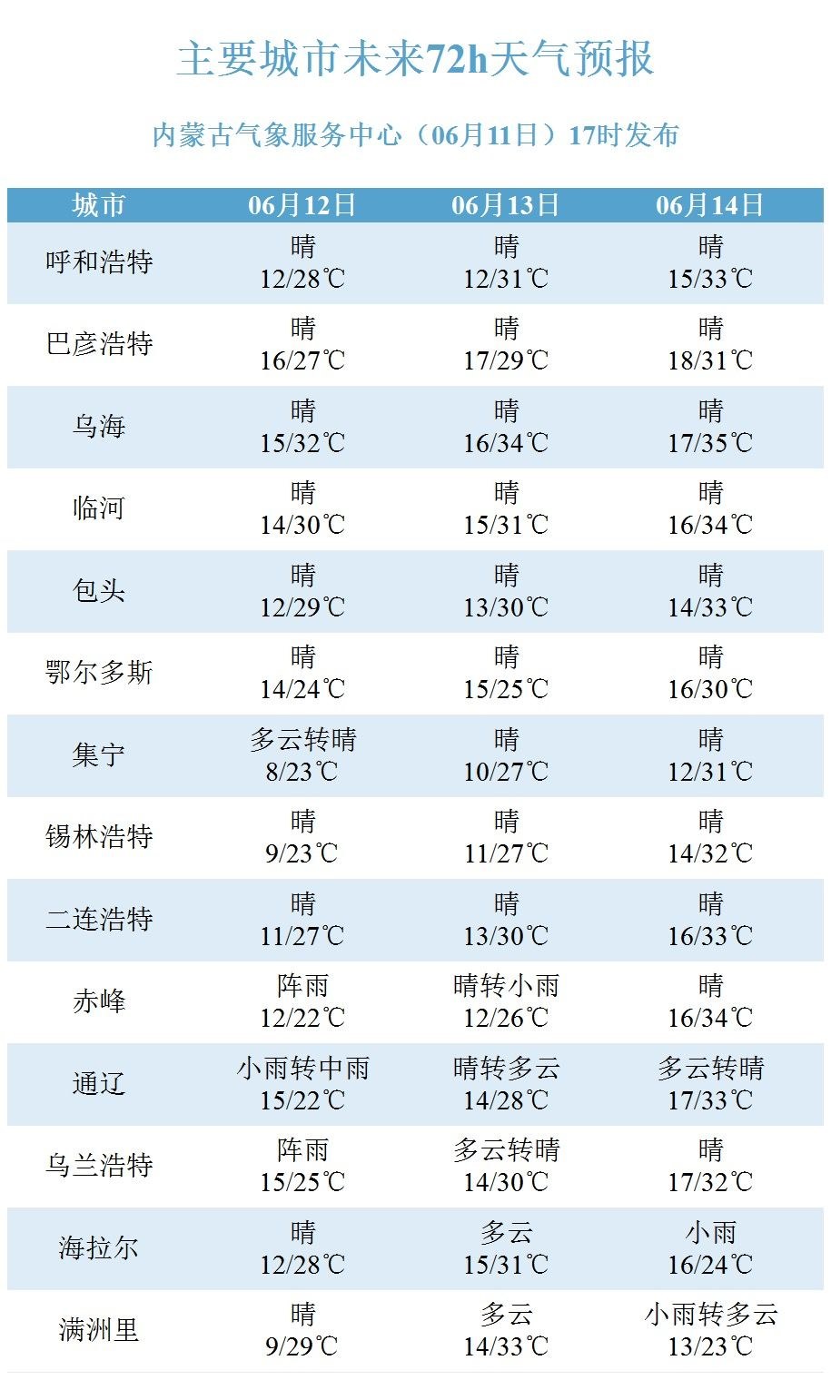 具體天氣預報為:12日白天到夜間,內(nèi)蒙古中部偏東和東部大部地區(qū)多云,其中,錫林郭勒盟東部、赤峰市、通遼市、興安盟大部、呼倫貝爾市南部部分地區(qū)有小雨或雷陣雨,上述地區(qū)可能伴有短時強降水、雷暴大風等強對流天氣,其余地區(qū)晴間多云;內(nèi)蒙古西部偏西和中部偏東地區(qū)4~5級東南風或偏北風;阿拉善盟西北部局地有35℃以上的高溫天氣。