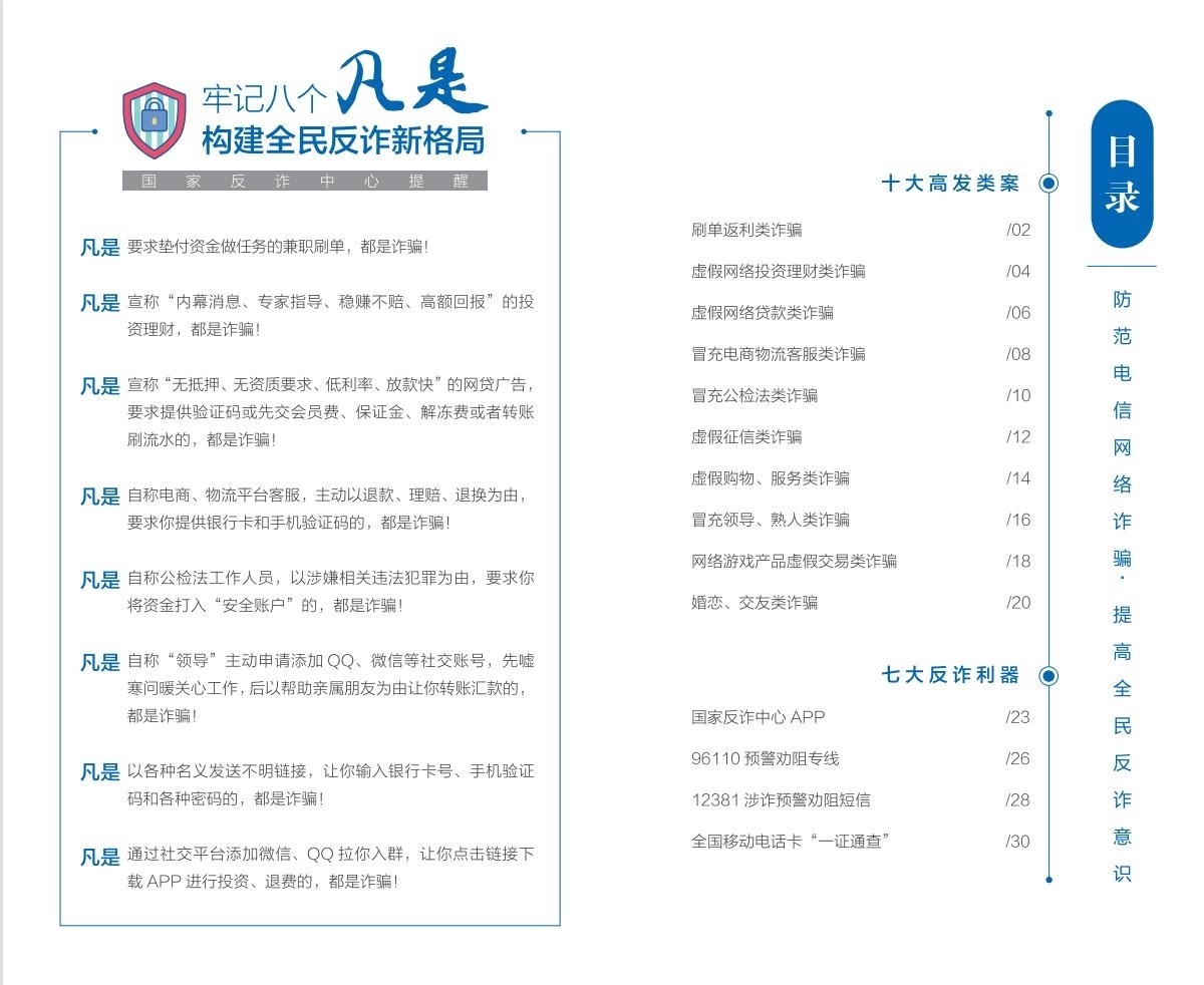 人民網(wǎng)北京6月16日電 (記者郝萍、梁秋坪)按照中央宣傳部、公安部聯(lián)合部署開展的“全民反詐在行動(dòng)”集中宣傳月活動(dòng)有關(guān)要求,國家反詐中心編寫制作并最新推出《2023版防范電信網(wǎng)絡(luò)詐騙宣傳手冊(cè)》(以下簡(jiǎn)稱《手冊(cè)》),詳細(xì)梳理10類高發(fā)電信網(wǎng)絡(luò)詐騙案件特點(diǎn)和詐騙手法,深入介紹7大反詐利器的主要功能和使用方法,進(jìn)一步擴(kuò)大反詐宣傳覆蓋面,提升廣大群眾識(shí)騙防騙意識(shí)和能力。