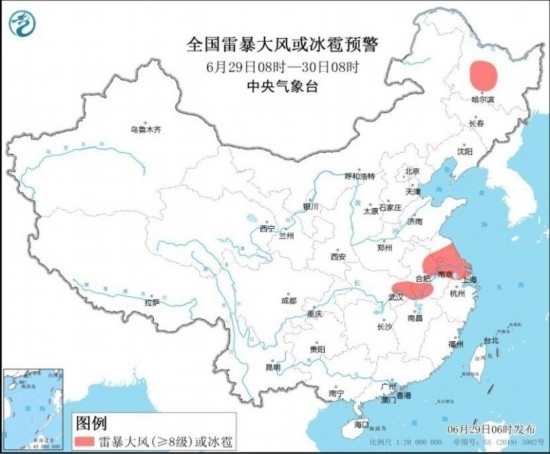 中央氣象臺6月29日06時繼續(xù)發(fā)布暴雨藍(lán)色預(yù)警和強(qiáng)對流天氣黃色預(yù)警:預(yù)計,6月29日08時至30日08時,黃淮南部、江淮、江漢中南部、江南北部、重慶東部以及黑龍江北部、內(nèi)蒙古東北部等地部分地區(qū)有大到暴雨,其中,湖北東部等地局地有大暴雨(100~150毫米)。上述部分地區(qū)伴有短時強(qiáng)降水(最大小時降雨量30~50毫米,局地可超過70毫米),黑龍江中部、安徽中南部、江蘇中南部、上海西北部、湖北東部等地的部分地區(qū)將有8~10級雷暴大風(fēng)或冰雹天氣,局地風(fēng)力11級,江蘇中南部局地可能伴有龍卷(見圖1和圖2)。強(qiáng)對流的主要影響時段為今天午后至夜間。