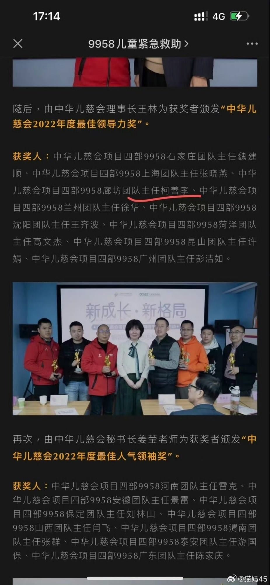 但對這份聲明,被騙家屬們并不認同。首先是涉案人員柯某孝的身份問題,此前中華兒慈會官方公眾號顯示,柯某孝為“中華兒慈會項目四部9958廊坊團隊主任”,獲“中華兒慈會2022年度最佳領(lǐng)導力獎”。目前,中華兒慈會官方公眾號文章已對這些內(nèi)容進行修改或刪除。