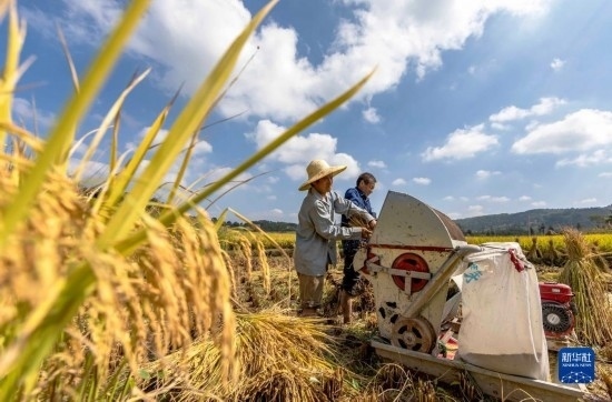 金秋時節(jié),各地農(nóng)民搶抓晴好天氣忙收獲,田間地頭一派繁忙景象。新華社發(fā)(磨桂賓 攝)