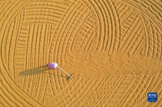 9月14日,河南省寶豐縣龍王溝鄉(xiāng)村振興示范區(qū)的農(nóng)民在晾曬谷子(無人機(jī)照片)。