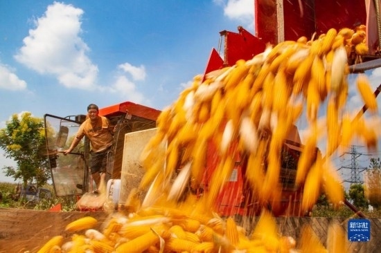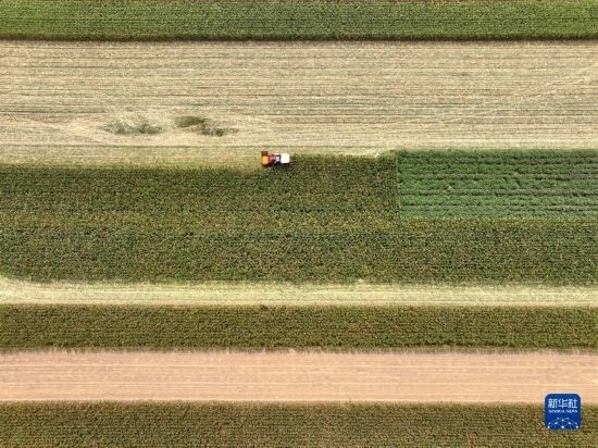 9月14日,農(nóng)民駕駛農(nóng)機(jī)在河南省駐馬店市汝南縣羅店鎮(zhèn)袁莊村收獲成熟的玉米。