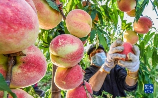 9月11日,河北省遵化市東舊寨鎮(zhèn)五虎嶺村農(nóng)民在采摘鮮桃。