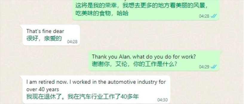“通過(guò)對(duì)方發(fā)來(lái)的照片可以觀察他居住的環(huán)境、開的車等等,判斷他有沒有錢,沒有錢就直接丟掉不聊了。詐騙團(tuán)伙里的組長(zhǎng)、團(tuán)長(zhǎng)或者是其他騙到很多錢的人,也會(huì)分享自己聊天經(jīng)驗(yàn),告訴我們有哪些地方需要改進(jìn)?!?/p>