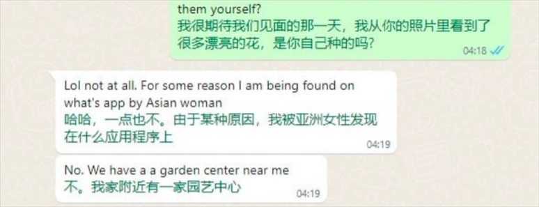 例如,在“聊天范例”中,詐騙人員偽裝的女性詢問(wèn)對(duì)方:“我從你的照片里看到了很多漂亮的花,是你自己種的嗎?”張先生說(shuō),其目的就是想判斷對(duì)方的居住環(huán)境。