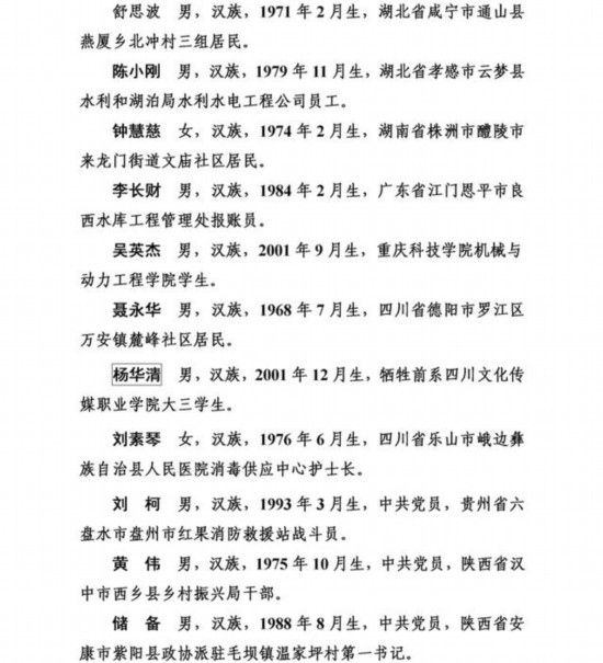 上榜勇士中,有從高橋上跳水救人導(dǎo)致胸椎骨折的外賣小哥彭清林和另一位高橋跳水救人的中學(xué)教師丁成闖;有冒著9級大風(fēng)在海上營救遇險臺胞的漁民蔡芳輪、蔡勝利;有放棄登頂珠峰機(jī)會而救助同胞的珠峰登山隊(duì)隊(duì)員范江濤、謝如祥;有萬米高空機(jī)艙里搶救瀕危病人的護(hù)士長劉素琴;有勇斗盜賊被刺幾刀仍不退縮的江蘇村民李培武;有身患癌癥卻橫渡淥江河救人的樂觀大姐鐘慧慈;有跳進(jìn)充滿沼氣深井救人致多器官感染的山東小伙李字旭;更有冒死救援落水群眾壯烈犧牲的潘燦燦、朱先鴿、尹新朋、喬軍、徐毅暉、楊華清、陳江七位勇士,讓我們致以最崇高的敬意!