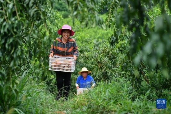 7月7日,在臨湘市聶市鎮(zhèn)乘嶺社區(qū)的涓湖果園,果農(nóng)在采摘蟠桃。