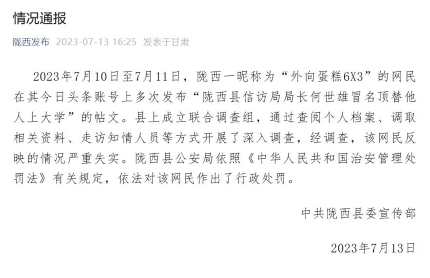 ·信訪局局長(zhǎng)被舉報(bào)冒名頂替他人上大學(xué),甘肅隴西縣通報(bào):嚴(yán)重失實(shí)!