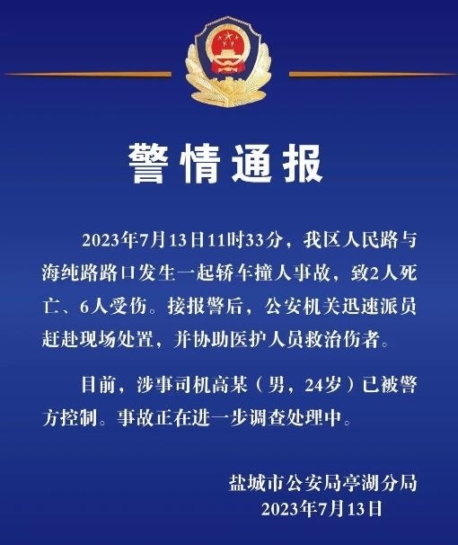 ·江蘇鹽城發(fā)生轎車撞人事故致2死6傷,涉事司機(jī)已被控制。