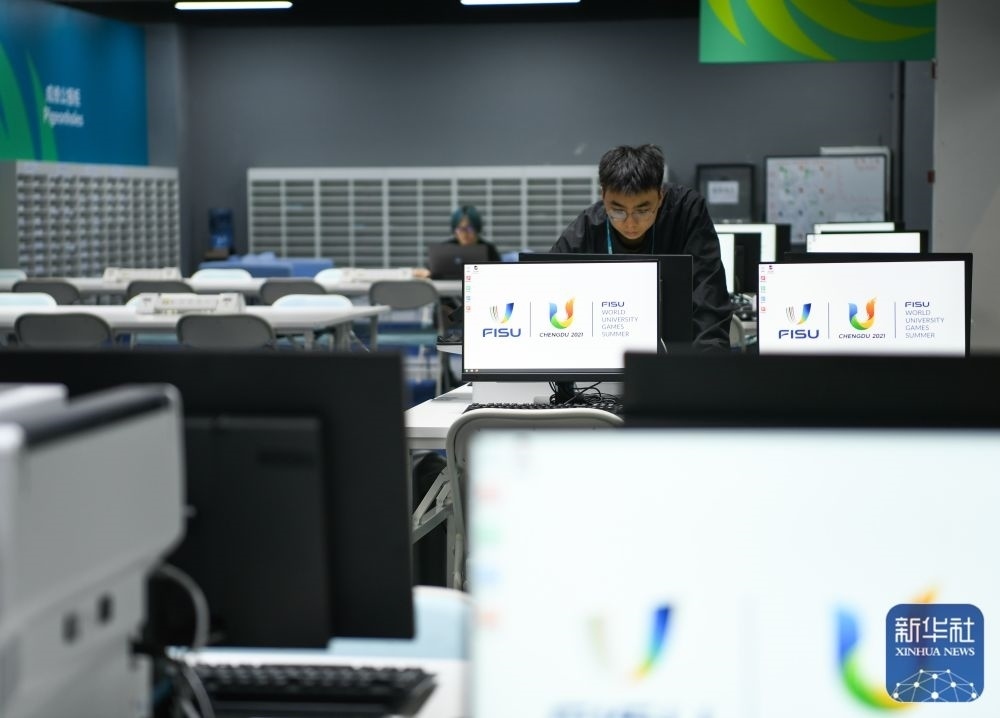 ↑7月13日,在成都大運會主媒體中心,工作人員正在調試媒體工作間的電腦。新華社記者 王曦 攝
