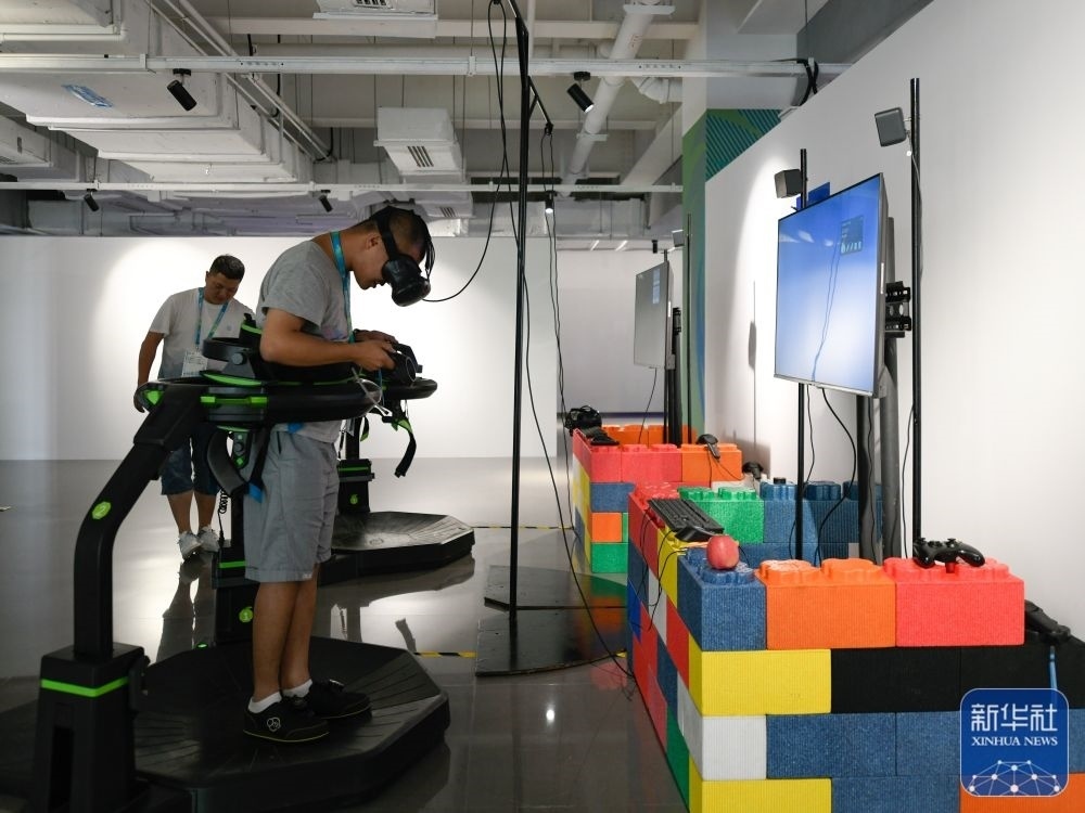 ↑7月14日,媒體工作人員在成都大運會主媒體中心休閑娛樂區(qū)內體驗VR游戲。新華社記者 胥冰潔 攝