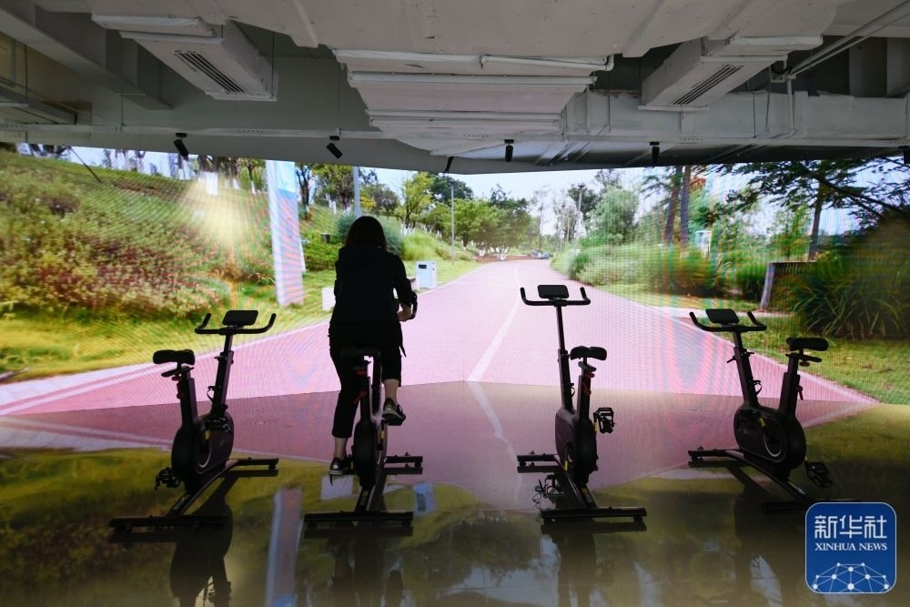 ↑7月14日,媒體工作人員在成都大運會主媒體中心休閑娛樂區(qū)內體驗騎行。新華社記者 胥冰潔 攝