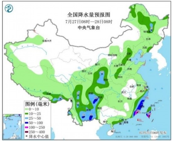 預(yù)計(jì),7月25日08時(shí)至26日08時(shí),重慶中南部、四川南部、云南東北部、貴州北部、湖南西北部、湖北西部以及江蘇北部、西藏東南部、臺(tái)灣島東部等地的部分地區(qū)有大到暴雨,其中,重慶東南部、四川南部、貴州北部等地局地有大暴雨(100~150毫米)(見圖1);上述部分地區(qū)伴有短時(shí)強(qiáng)降水(最大小時(shí)降雨量20~50毫米,局地可超過70毫米),局地有雷暴大風(fēng)等強(qiáng)對(duì)流天氣。中央氣象臺(tái)7月25日06時(shí)繼續(xù)發(fā)布暴雨藍(lán)色預(yù)警。