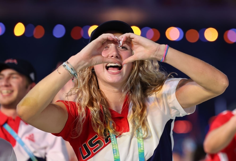 7月28日,美國(guó)大學(xué)生體育代表團(tuán)在開(kāi)幕式上入場(chǎng)。新華社記者 楊青 攝