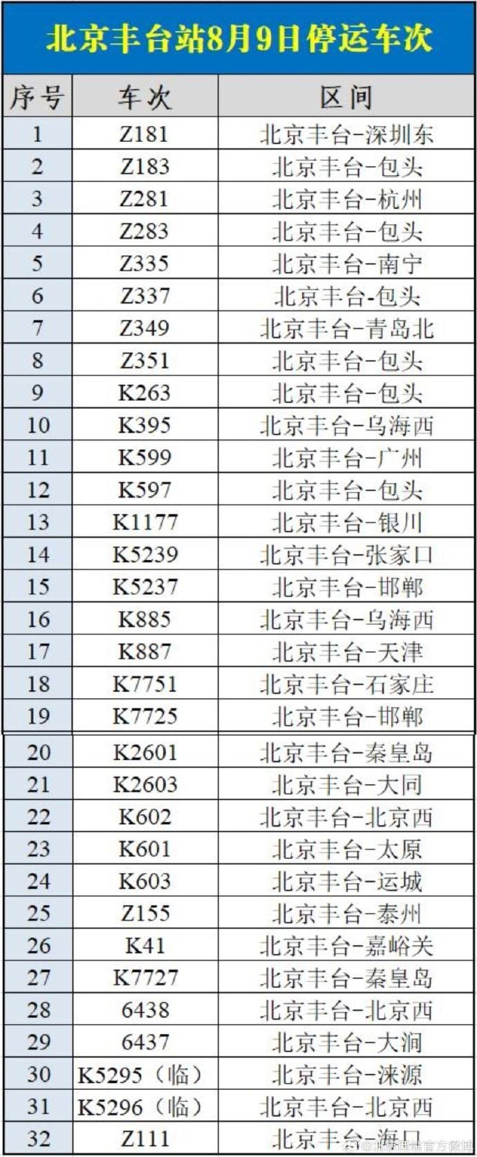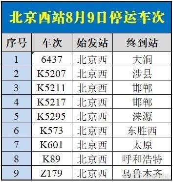 央視網(wǎng)消息:據(jù)@北京西站官方微博 消息,受水害影響,8月9日北京西站、北京豐臺站部分列車停運,已購買停運列車車票的旅客,可于30日內(nèi)辦理全額退票手續(xù)。請廣大旅客合理安排出行,關(guān)注鐵路部門公告。