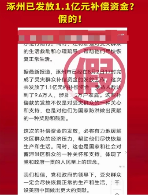 近日,網(wǎng)傳消息稱“河北省涿州市已經(jīng)在8月2日完成了1.1億受災(zāi)群眾補償資金的發(fā)放工作,受益人數(shù)達(dá)到了9.6萬人,涉及3.5萬戶家庭”。