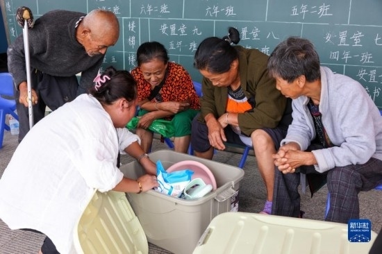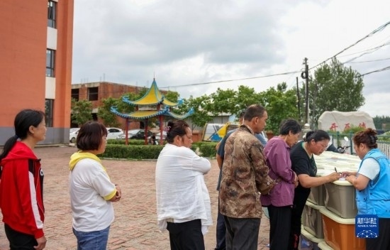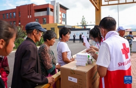 8月11日,居民在吉林省舒蘭市舒蘭三中居民安置點領取舒蘭市紅十字會發(fā)放的藥品物資。