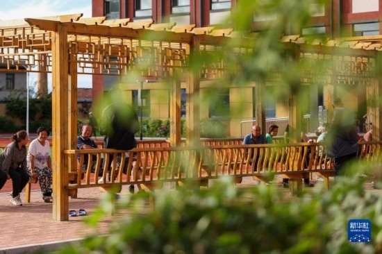 8月11日,居民在吉林省舒蘭市舒蘭三中居民安置點院內的長廊里休憩。