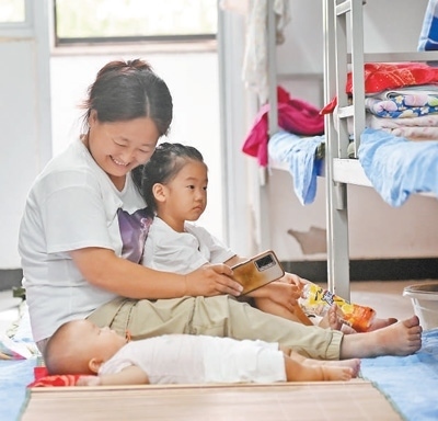 8月12日,在天津市靜海區(qū)大邱莊中學(xué)集中安置點(diǎn),轉(zhuǎn)移群眾在宿舍內(nèi)照看孩子。新華社記者 趙子碩攝