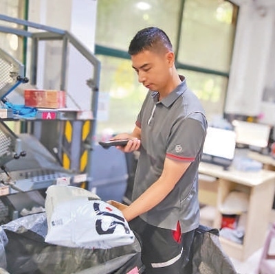 午后,湖北順豐速運(yùn)有限公司武漢唐家墩網(wǎng)點(diǎn),張?jiān):屯聜兪炀毜貙⒋笮〔灰坏目爝f件分類,裝入不同的袋子中。每裝滿一個(gè)編織袋,張?jiān)>驮诖谙路劫N上二維碼,再用機(jī)器掃描登記,確認(rèn)無誤后裝車發(fā)運(yùn)。