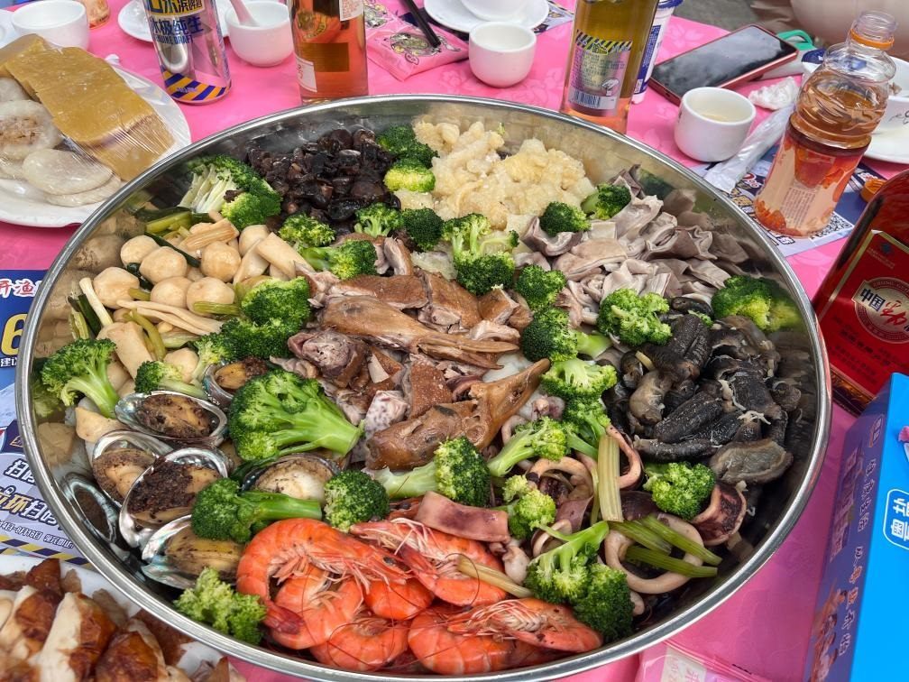 開漁宴上鋪滿海鮮的漁家大盤菜。(陽江廣播電視臺供圖)