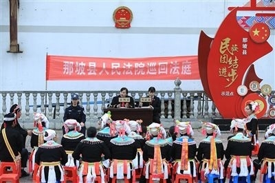 隆林各族自治縣人民法院以全國模范法官黃登林為榜樣,設立“登林巡回法庭”,創(chuàng)新運用黃登林“五大調解法”,開展壯漢、苗漢、彝漢等雙語巡回審判,滿足少數(shù)民族聚居地群眾的多元司法需求。同時,在德峨人民法庭打造“登林巡回法庭·崢嶸廳”和“民族團結同心苑”等文化場館,開展雙語普法,奏響“最炫民族風”司法文化品牌的新樂章。