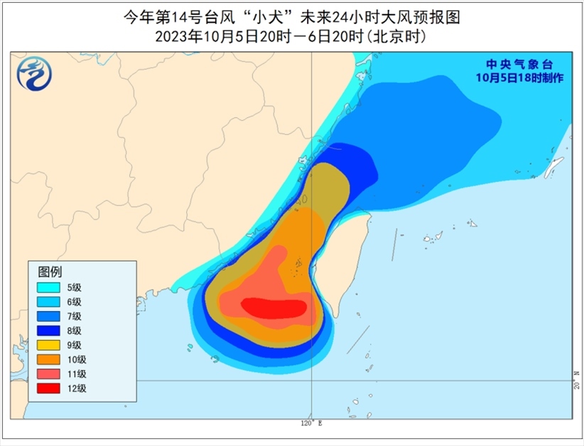 大風(fēng)預(yù)報(bào):5日20時(shí)至6日20時(shí),東海大部及釣魚島附近海域、巴士海峽西北部、臺(tái)灣海峽、南海東北部以及浙江沿海、福建沿海、廣東東部沿海、臺(tái)灣島北部沿海將有6-8級(jí)、陣風(fēng)9-10級(jí)的大風(fēng),其中巴士海峽西北部、臺(tái)灣海峽、南海東北部等地部分海域?qū)⒂?-10級(jí)、陣風(fēng)11-13級(jí)的大風(fēng),“小犬”中心經(jīng)過(guò)的附近海面風(fēng)力有11-13級(jí),陣風(fēng)14-15級(jí)。