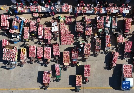 10月20日,果農(nóng)在延安市洛川縣一家果業(yè)企業(yè)售賣蘋果(無人機(jī)照片)。