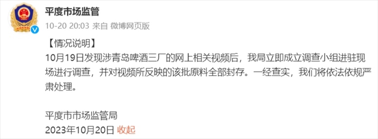 《每日經(jīng)濟新聞》記者注意到,青島啤酒三廠所在地的平度市市場監(jiān)管局也發(fā)布情況說明稱,10月19日發(fā)現(xiàn)涉青島啤酒三廠的網(wǎng)上相關(guān)視頻后,我局立即成立調(diào)查小組進駐現(xiàn)場進行調(diào)查,并對視頻所反映的該批原料全部封存?!耙唤?jīng)查實,我們將依法依規(guī)嚴肅處理?!?/p>