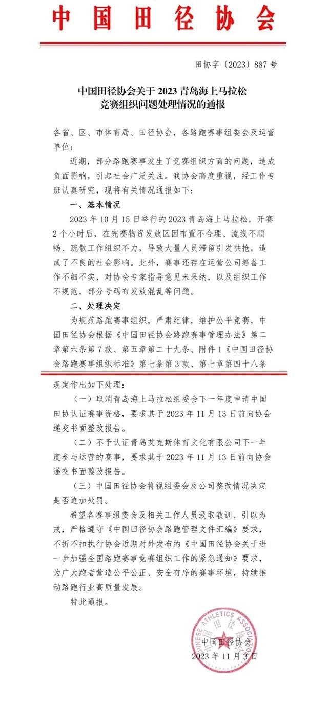 央視網(wǎng)消息:據(jù)“中國馬拉松平臺(tái)”官微消息,近日,部分路跑賽事出現(xiàn)了一些競(jìng)賽組織問題,引發(fā)社會(huì)廣泛關(guān)注,造成了不良的社會(huì)影響。中國田徑協(xié)會(huì)高度重視、全面調(diào)查,依據(jù)事實(shí)和路跑賽事管理規(guī)定,從加強(qiáng)競(jìng)賽組織,壓實(shí)各方主體責(zé)任,提示行業(yè)風(fēng)險(xiǎn)隱患的角度,對(duì)相關(guān)單位和人員進(jìn)行了相應(yīng)處理?,F(xiàn)將處理情況通報(bào)如下: