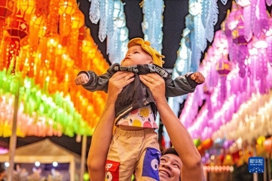 11月23日,在泰國(guó)南奔府哈利奔猜寺,一名男子舉著孩子觀賞燈籠。