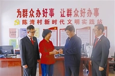 在法官的見證下,村委會(huì)干部將補(bǔ)償款送到陳某手中。