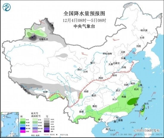 12月4日08時(shí)至5日08時(shí),新疆北部、西藏西南部和東部等地部分地區(qū)有小到中雪或雨夾雪,其中,新疆北疆東部和沿天山地區(qū)、西藏西南部等地部分地區(qū)有大到暴雪,局地大暴雪(20~25毫米)。江南大部、云南東部和南部、華南北部和西部、臺灣島等地部分地區(qū)有小到中雨,其中,臺灣島中北部等地部分地區(qū)有大雨(25~40毫米)。內(nèi)蒙古中西部、遼東半島、新疆北部等地部分地區(qū)有4~6級風(fēng)。