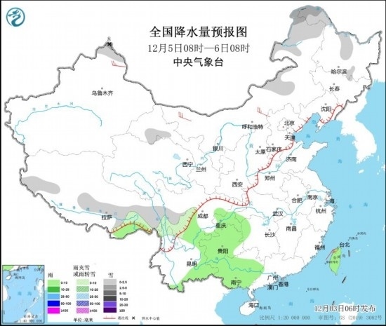 全國降水量預(yù)報(bào)圖(12月5日08時(shí)-6日08時(shí))