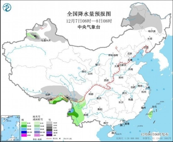 12月7日08時至8日08時,內(nèi)蒙古東部、黑龍江中西部、新疆北部、西藏東部、川西高原南部、云南西北部等地部分地區(qū)有小到中雪或雨夾雪,其中,新疆伊犁河谷、西藏東南部等地局地有大到暴雪(10~12毫米)。西藏南部、四川南部、云南中西部、臺灣島等地部分地區(qū)有小到中雨,其中,云南西部局地有大雨(25~45毫米)。內(nèi)蒙古中部、新疆北疆等地部分地區(qū)有4~6級風。