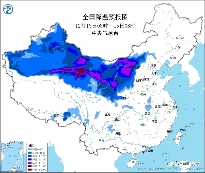 其中,12月13日08時(shí)至12月15日08時(shí),新疆、內(nèi)蒙古西部和中部、甘肅、寧夏、青海、陜西北部、山西西部等地將出現(xiàn)8~12℃降溫,甘肅、寧夏、內(nèi)蒙古河套地區(qū)、陜西北部局地降溫可達(dá)14℃以上。