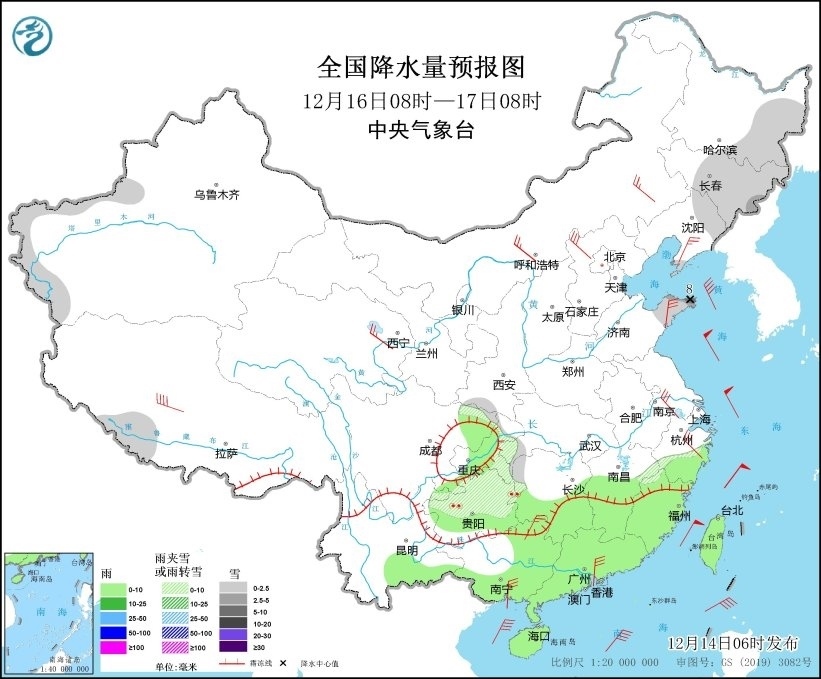 12月16日08時(shí)至17日08時(shí),新疆南疆西部山區(qū)、黑龍江東部、吉林大部、遼寧東北部和遼東半島、山東半島、重慶東部、貴州中北部等地部分地區(qū)有小到中雪或雨夾雪,其中,山東半島北部等地部分地區(qū)有大雪(5~8毫米)。貴州等地局地有凍雨。江南中南部、四川盆地東部、華南大部等地部分地區(qū)有小雨。內(nèi)蒙古中東部、遼東半島、華北北部、山東半島、江南東部、華南沿海地區(qū)等地部分地區(qū)有4~6級(jí)風(fēng)(見(jiàn)圖7)。