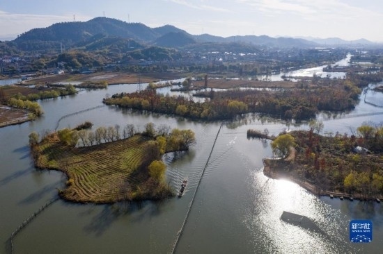 空中俯瞰諸暨市白塔湖國家濕地公園(無人機照片,12月14日攝)。