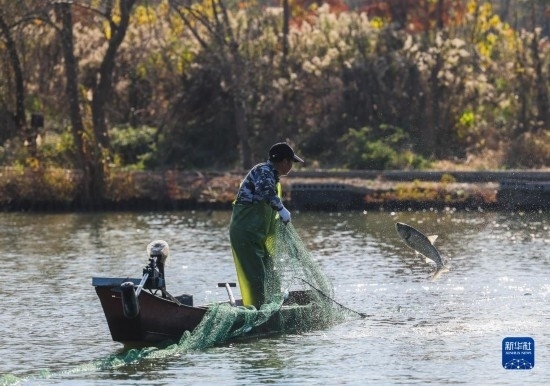 12月14日,在諸暨市白塔湖國營漁場的水域內,漁民在放網捕魚。